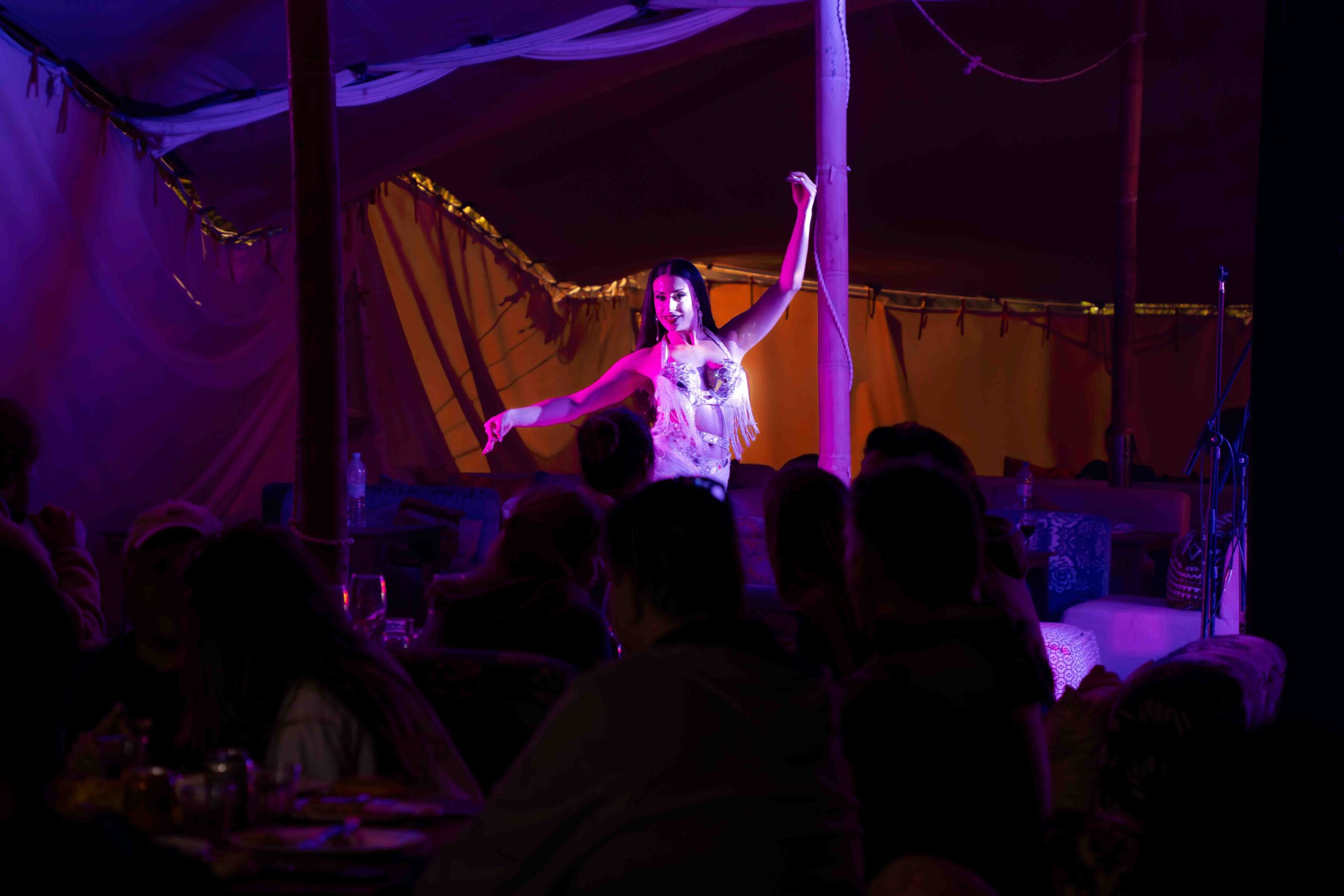 La magie se poursuit sous une tente traditionnelle sahraouie, dressée à l’abri du vent, au milieu du désert. Autour d’un dîner typique, préparé avec soin, les convives partagent un moment de convivialité et de découverte. Puis vient le temps du show musical live, vibrant et authentique, mêlant sons d’ailleurs et rythmes du désert.